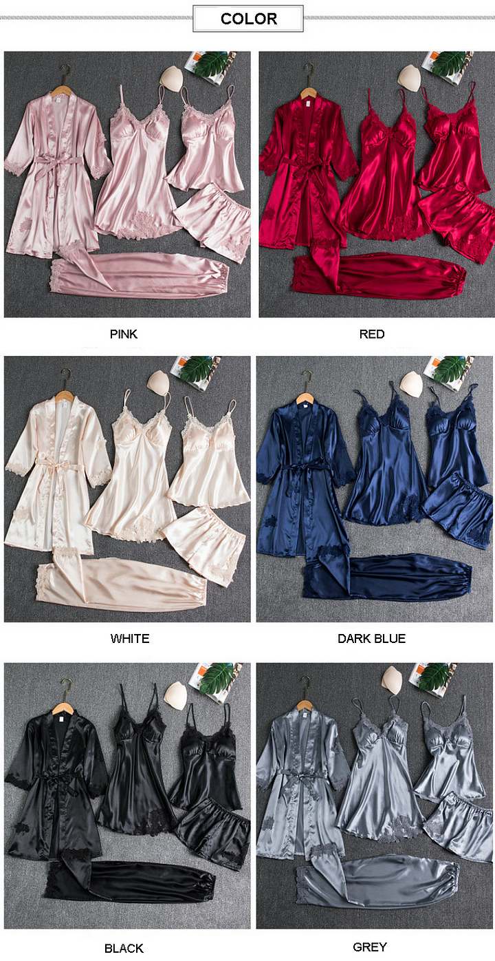 The product is made of 100% high-quality silk. Soft, air permeability, and absorbent. It will bring absolute comfort to your skin and help you fall asleep. It has many individual colors with lace makes the sleepwear special. The adjustable shoulder straps, the removable chest pads and easy to wear. This set includes a camisole, shorts, sleepwear dress, trousers and a night robe. You can choose any type you like and change it daily. This pajama set for women featuring classic casual loungewear set style. Machine washable, or hand wash. Get yours now!